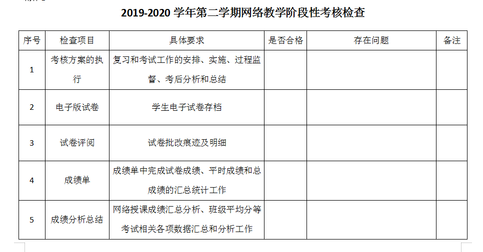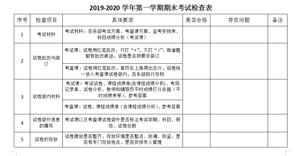 本次检查根据我校《学生学业考核管理办法》《试卷阅卷与存档要求》等考务制度,制定检查表开展检查。