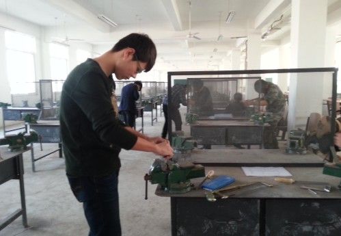学生在钳工试验台进行操作