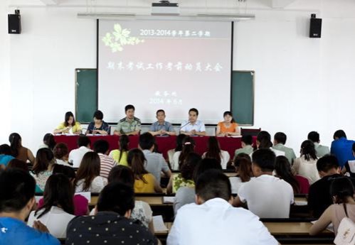 大会上,齐小青副处长首先宣读了《2013-2014学年第二学期期末考试方案》,对本次考试作出具体安排,并向监考老师详细解读考试流程和注意事项。要求老师们严格、认真履行监考职责。其次,学生处禹建军处长就本次考试相关的学生工作进行安排。他强调,辅导员和教官首先要分管任务,积极做好考前教室卫生打扫和桌椅摆放等事宜,并及时召开考前动员会,树立学生诚信考试理念。随后,李良玉副校长对本次考试提出几点要求:第一,学校各部门要密切配合,加强沟通,有问题要及时反馈;第二,监考老师要高度重视,给学生考试后老师们要客观改卷,认真阅卷,确保考试成绩的真实、可靠、客观。