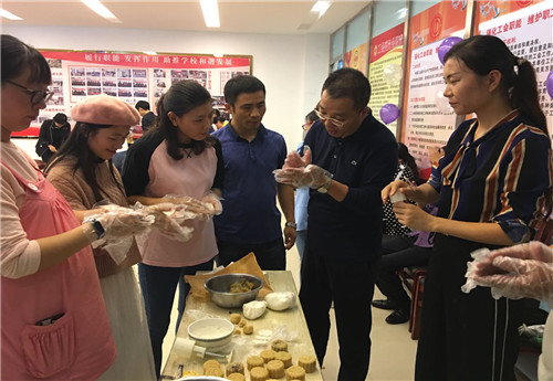 校党委书记尚亚民,副校长、工会主席张爱云参加月饼制作活动
