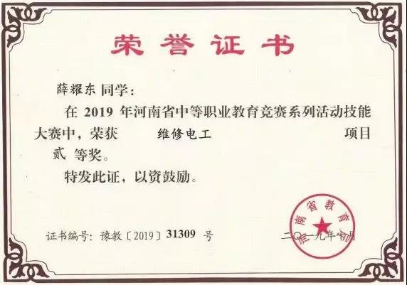 我校也非常重视学生技能水平的培养,想尽办法走出去,努力提升学校的教学质量。2019年10月19日,人工智能系18秋机器人1班薛耀东同学代表学校参加河南省中等职业学校“维修电工”全员化比赛,在申伟鹏、王亚新两位老师的指导下,喜获省级二等奖。
