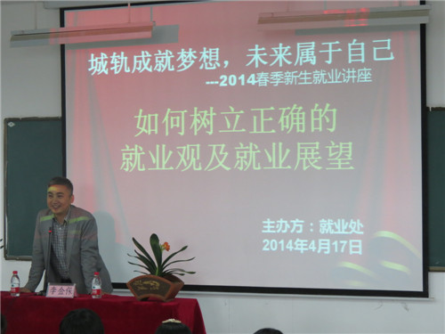 为我校学生深入了解当前就业形势,提升就业竞争意识,全面引导学生树立正确就业观,就业处于4月17日(周四)中午,在教学楼C1-C2阶梯教室同步开展,针对2014级全体春季新生开展《如何树立正确的就业观及就业展望》专题讲座,并邀请教育厅就业工作评估专家李金保教授来我校与学生座谈,就业处老师、学生代表张斯斯、张雯雯陪同参会。