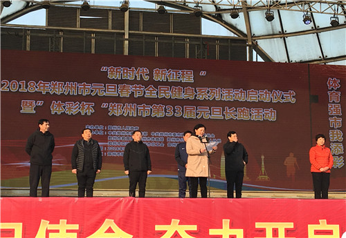 跑进新时代,踏上新征程!2018年1月1日,由郑州市人民政府主办,市委宣传部、市委市直机关工委、市总工会、共青团郑州市委员会、市教育局、市公安局、市人社局、市卫计委、市体育局等单位共同承办的2018年元旦春节“新时代 新征程”全民健身系列活动启动仪式暨郑州市第33届“体彩杯”元旦长跑活动在绿城广场鸣枪开跑。我校学生处、团委部分老师和百余名学生在副校长、工会主席张爱云的带领下,与万余名市民共同参加了此次活动。