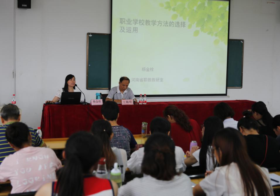培训首先从校外专家学者的讲座展开,内容不仅着眼于中职教育教学模式、方法、理论等宏观视野,而且对小组合作学习、听评课、说课等教学细节给予了微观上的指导。潘洪亮院长、陈景国副院长、张玉霞副主任针对我校特点,分别从板书的设计、学生心理、学校教学制度规范等方面进行了讲座。随后,省级优质课一等奖获得者褚晶晶老师为我们呈现了一场精彩的观摩课,另外黄小东等优秀教师对暑期教师培训成果进行了展示。