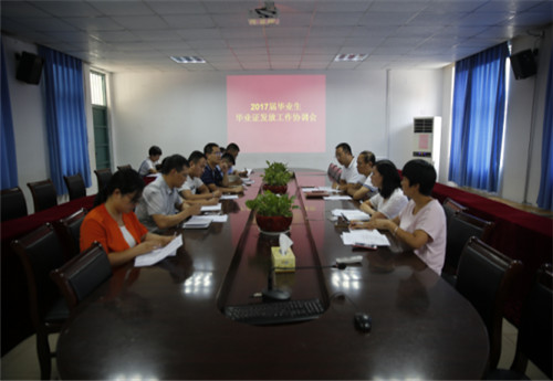 为了规范毕业生毕业证、就业报到证(以下简称“两证”)发放流程,圆满完成2017届毕业生两证发放工作,我校于2017年8月23日下午14:00,在行政楼一楼会议室召开了2017届毕业生“两证”发放工作协调会。此次会议由教务处牵头召开,学校领导高度重视,副校长王海明、陈景国、相关处室负责人等出席了本次会议。